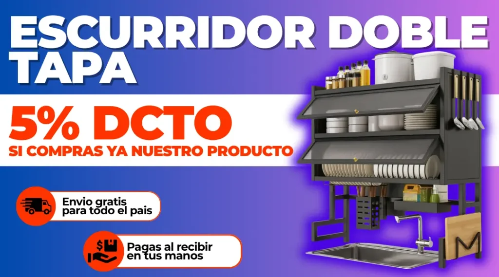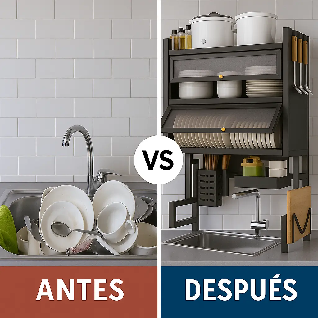 Se instala justo encima del lavaplatos para liberar tu mesón y darte más espacio para cocinar, limpiar y moverte sin caos ni desorden.
