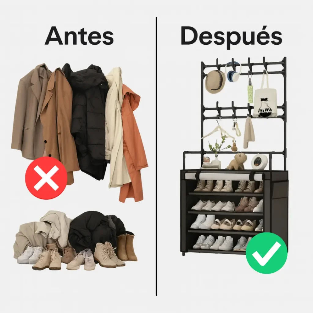 Si tu casa se siente cada vez más pequeña y el desorden se acumula, este zapatero–perchero 5 en 1 llega para darte el respiro que necesitas.